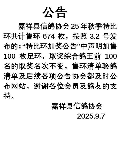 嘉祥县信鸽协会2025年秋季特比环售环清单