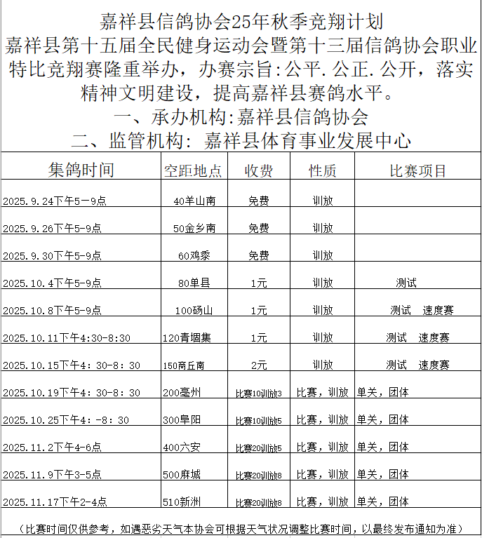 2025年嘉祥县信鸽协会秋季特比环比赛报备审批