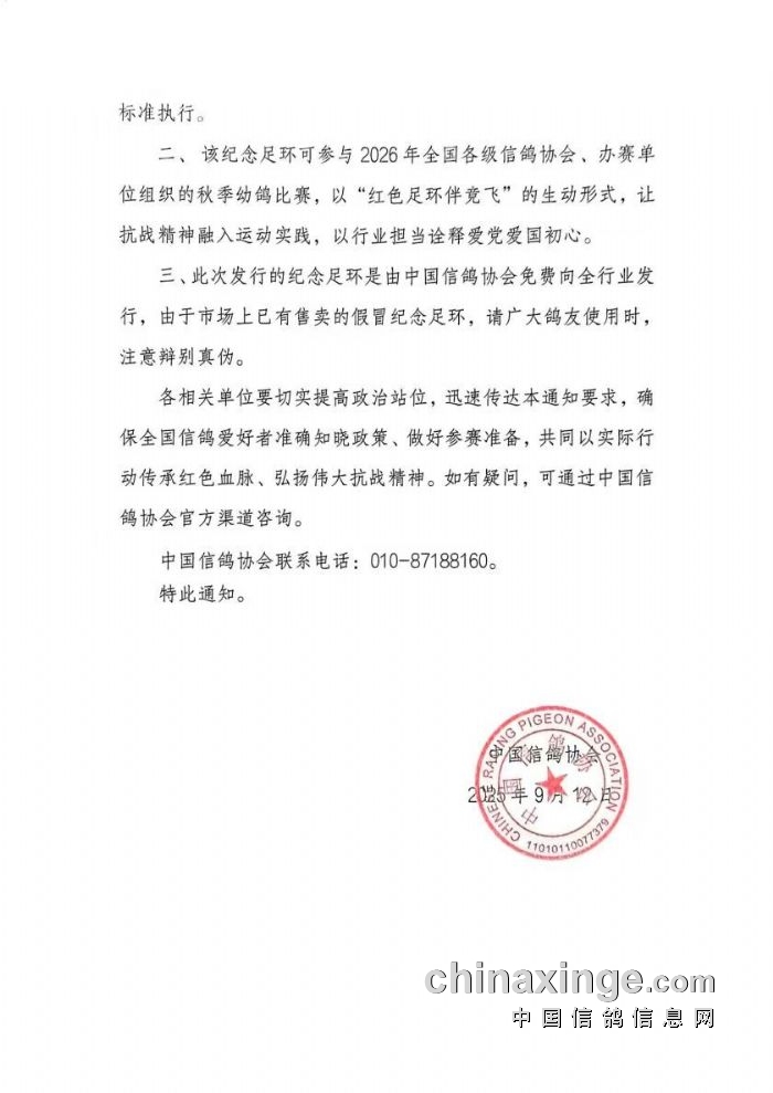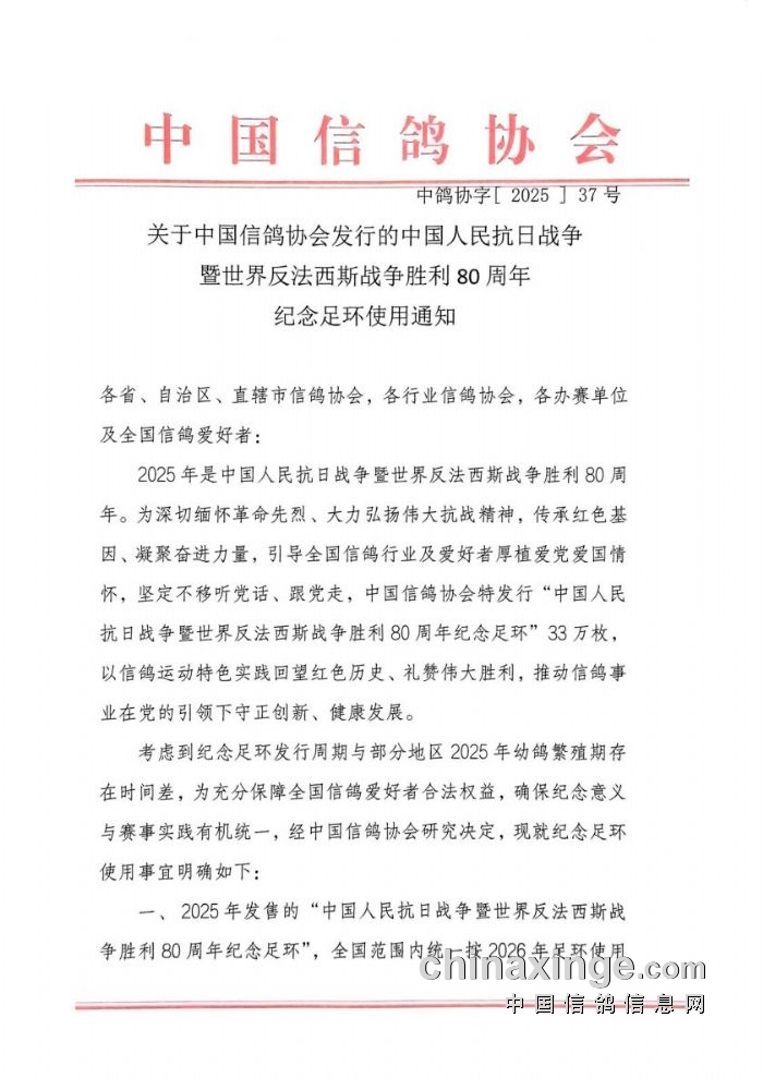 关于中国信鸽协会发行中国人民抗日战争暨世界反法西斯战争胜利80周年纪念足环使用通知