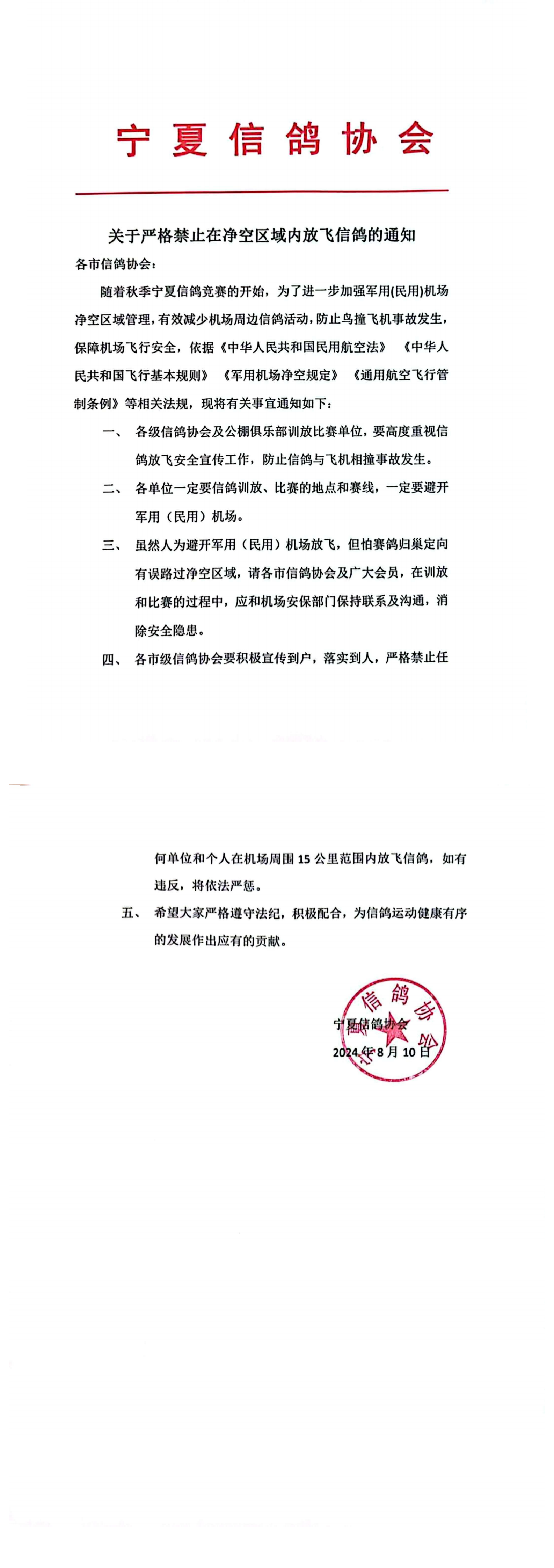 关于严格禁止在净空区域内放飞信鸽的通知