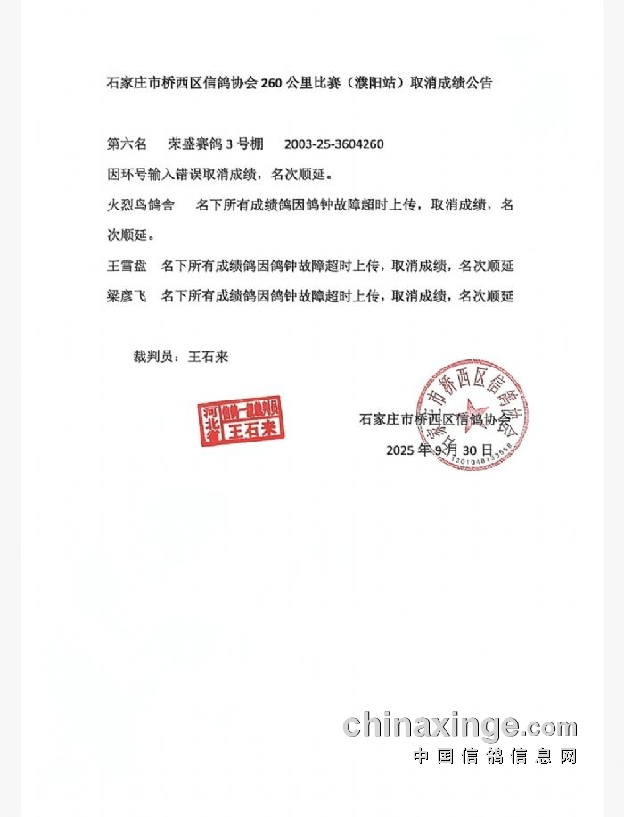 河北张氏鸽苑 20-03-2174413 25-03-262580 因环号输入错误取消成绩,名次顺延。