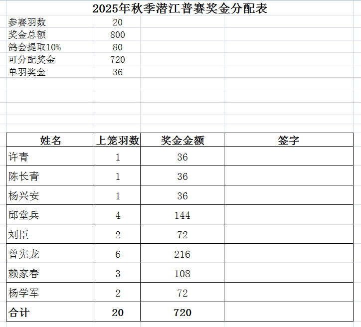 2025年秋季潜江普赛奖金分配表
