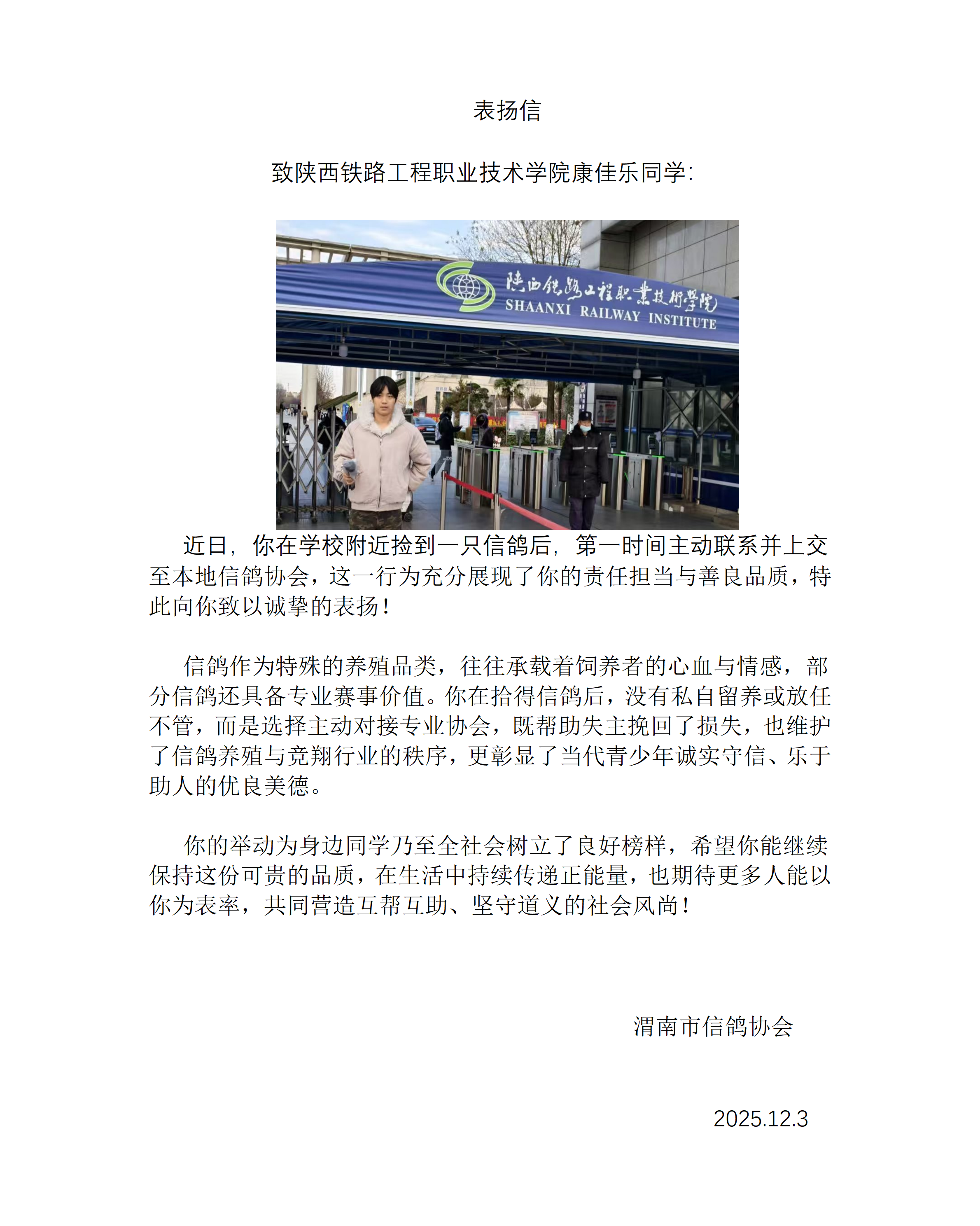 弘扬正能量,传递善与责——渭南市信鸽协会表扬陕铁院康佳乐同学