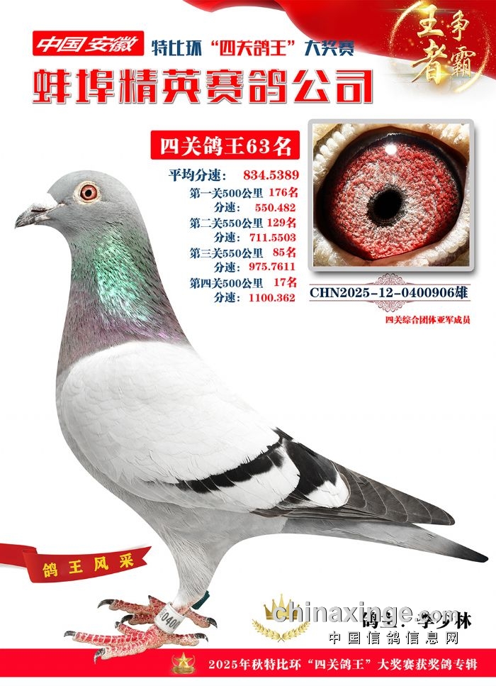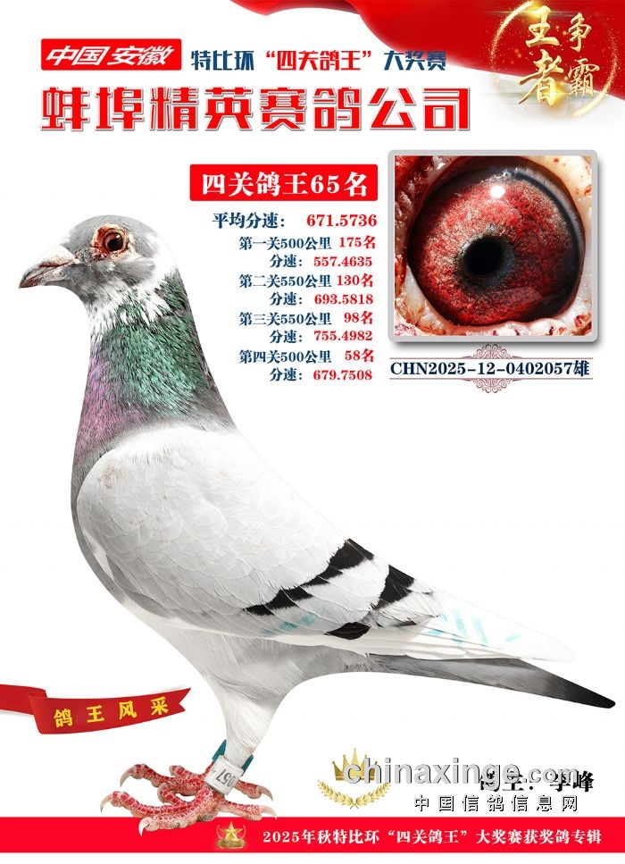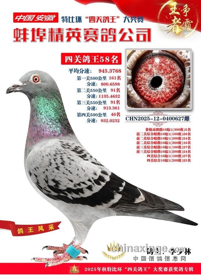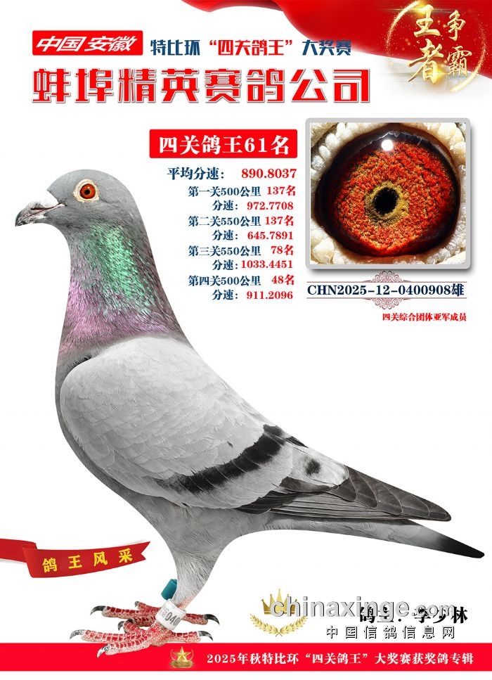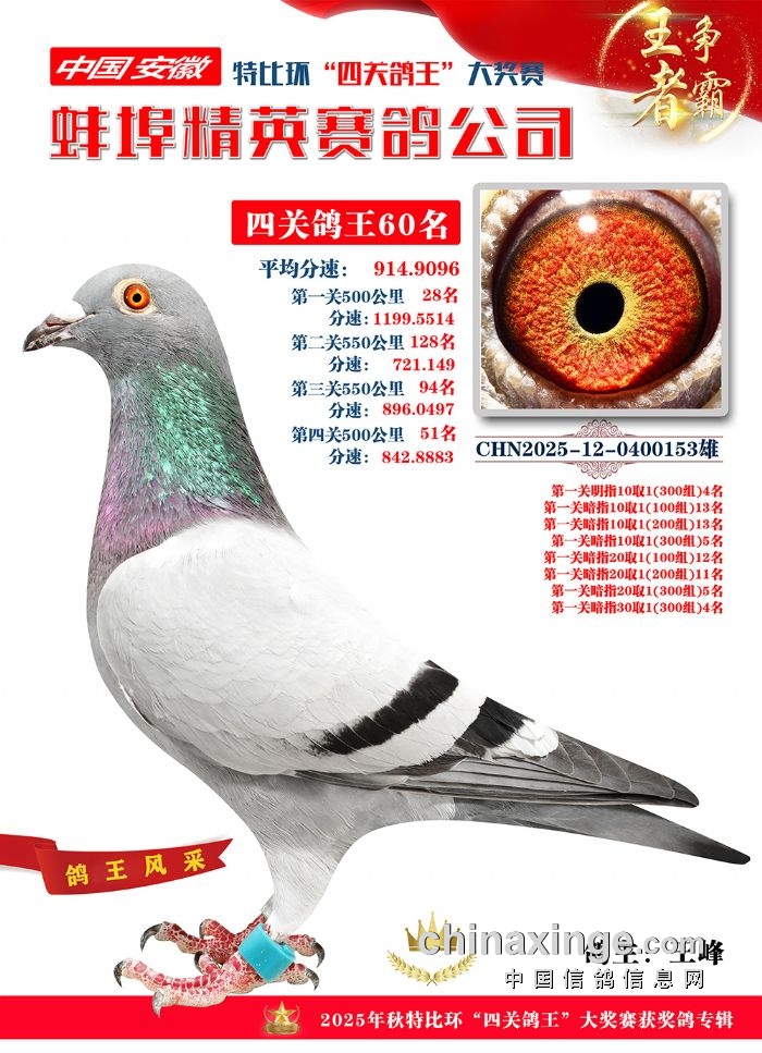 蚌埠精英赛鸽公司2025年秋季特比环“四关鸽王”靓照欣赏(1-15名)