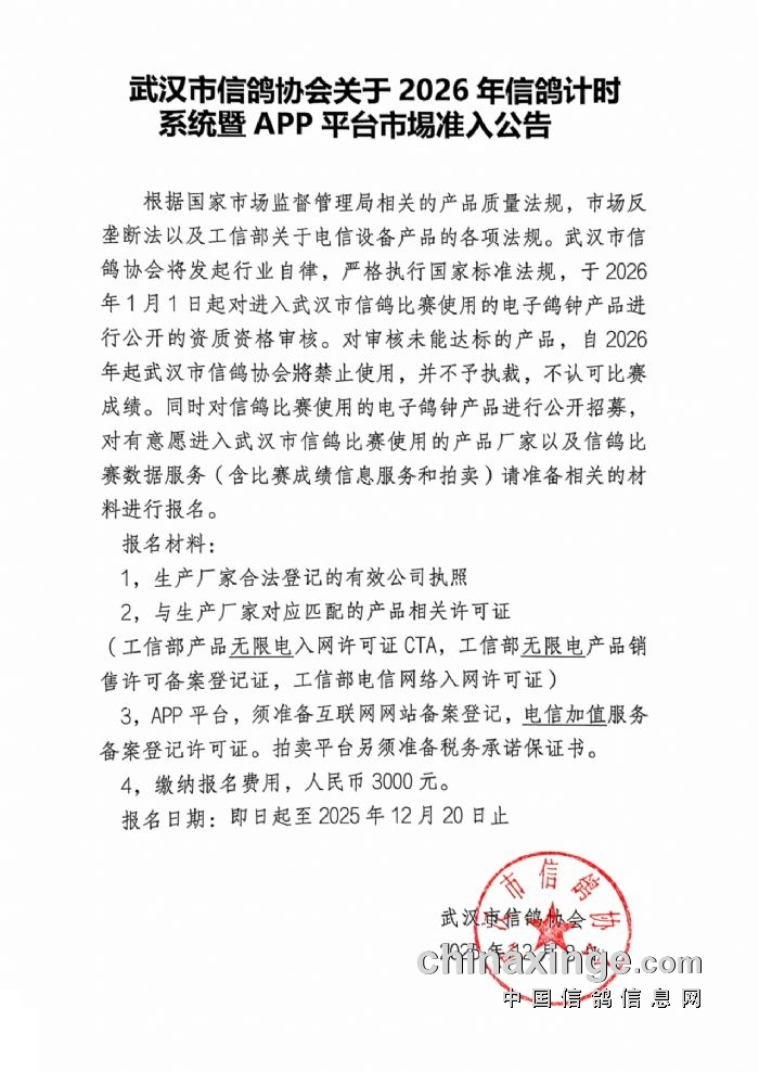 武汉市信鸽协会关于2026年信鸽计时 系统暨APP平台市埸准入公告