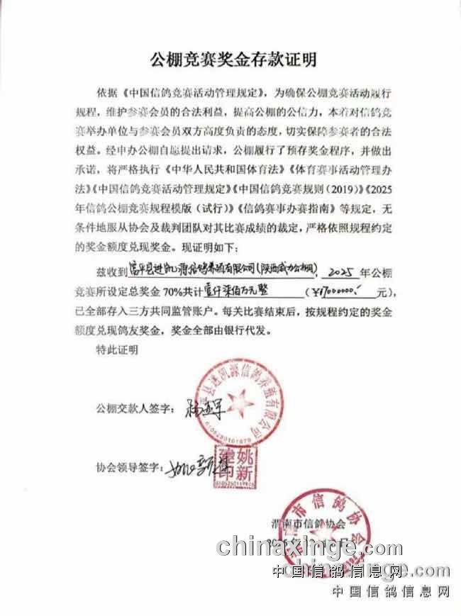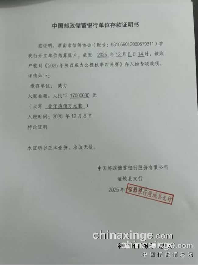 根据《中国信鸽竞赛活动管理规定》及相关规程要求,为确保公棚竞赛奖金安全、切实保障参赛会员合法权益,渭南市信鸽协会对威力公棚2025年度竞赛奖金存款情况进行了核实与监管。