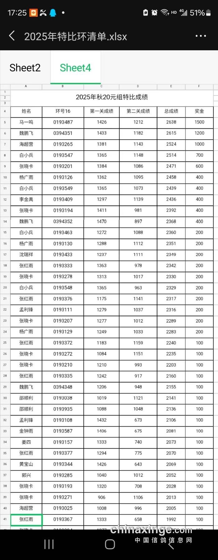 禹州市信鸽协会2025年秋季特比环50元成绩