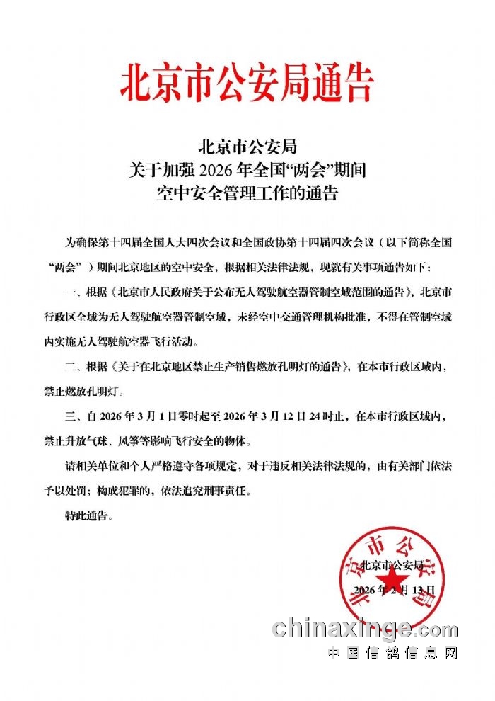 转发北京市公安局关于加强2026年全国“两会”期间空中安全管理工作的通告