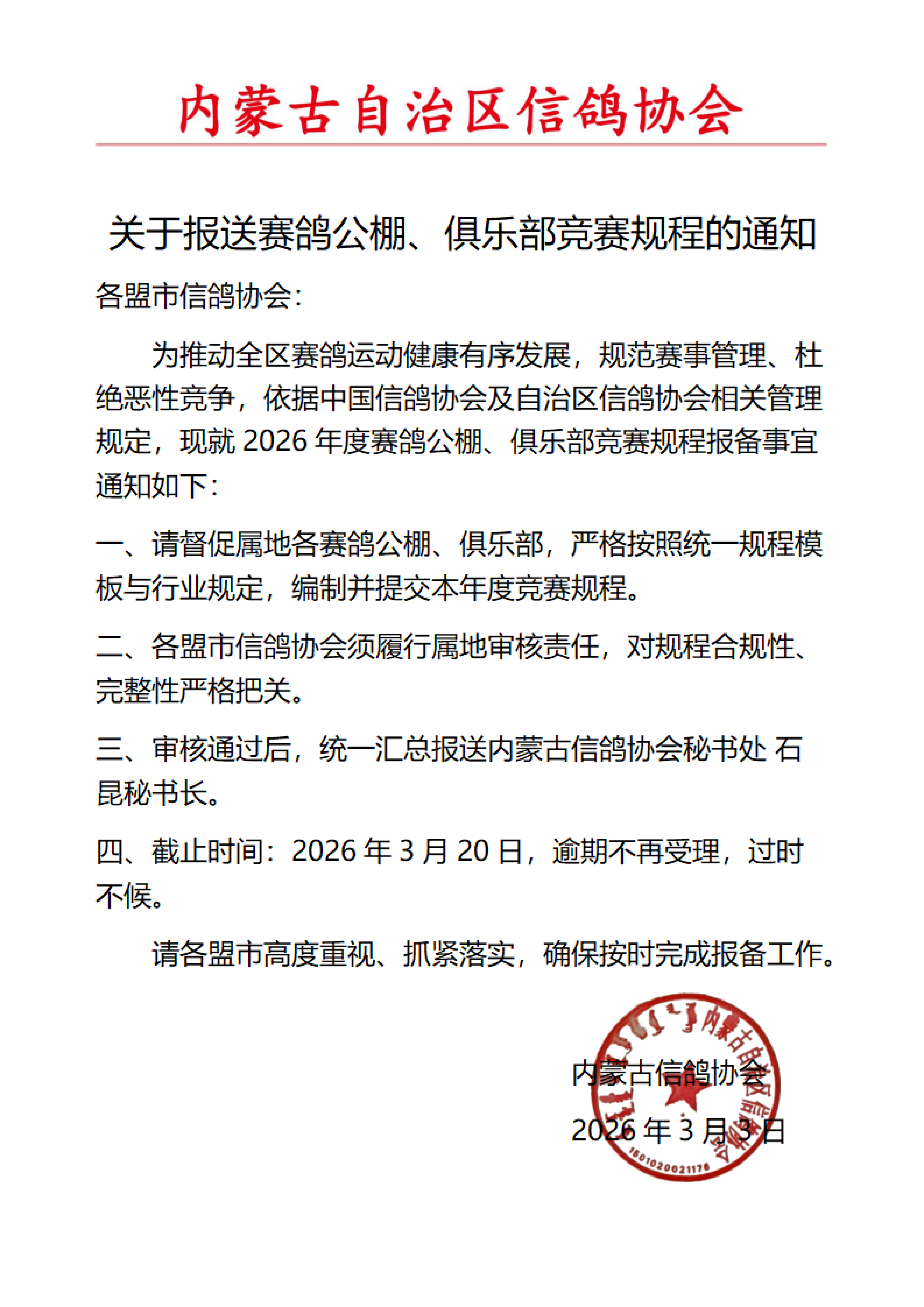 内蒙古自治区信鸽协会致全体会员的一封信