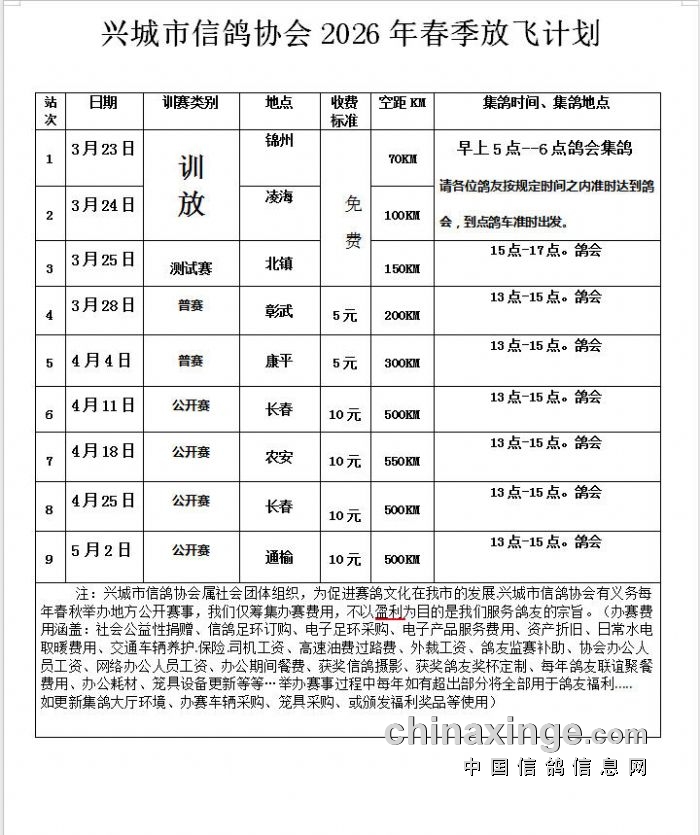 兴城市信鸽协会2026年春季放飞计划