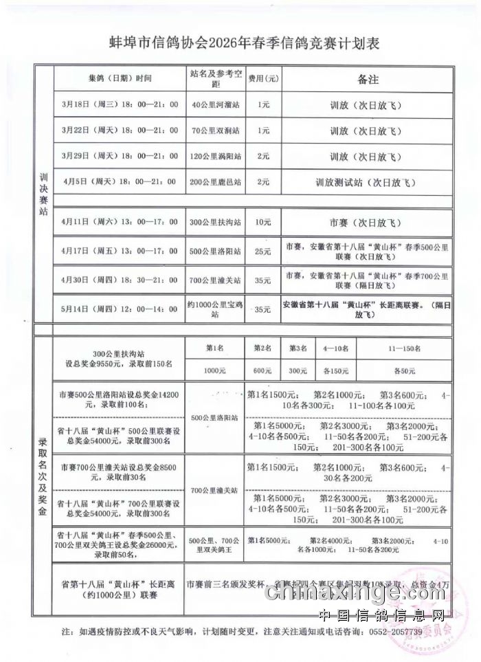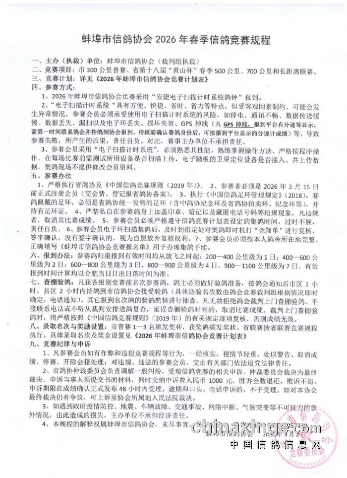 蚌埠市信鸽协会2026年春季信鸽竞赛规程