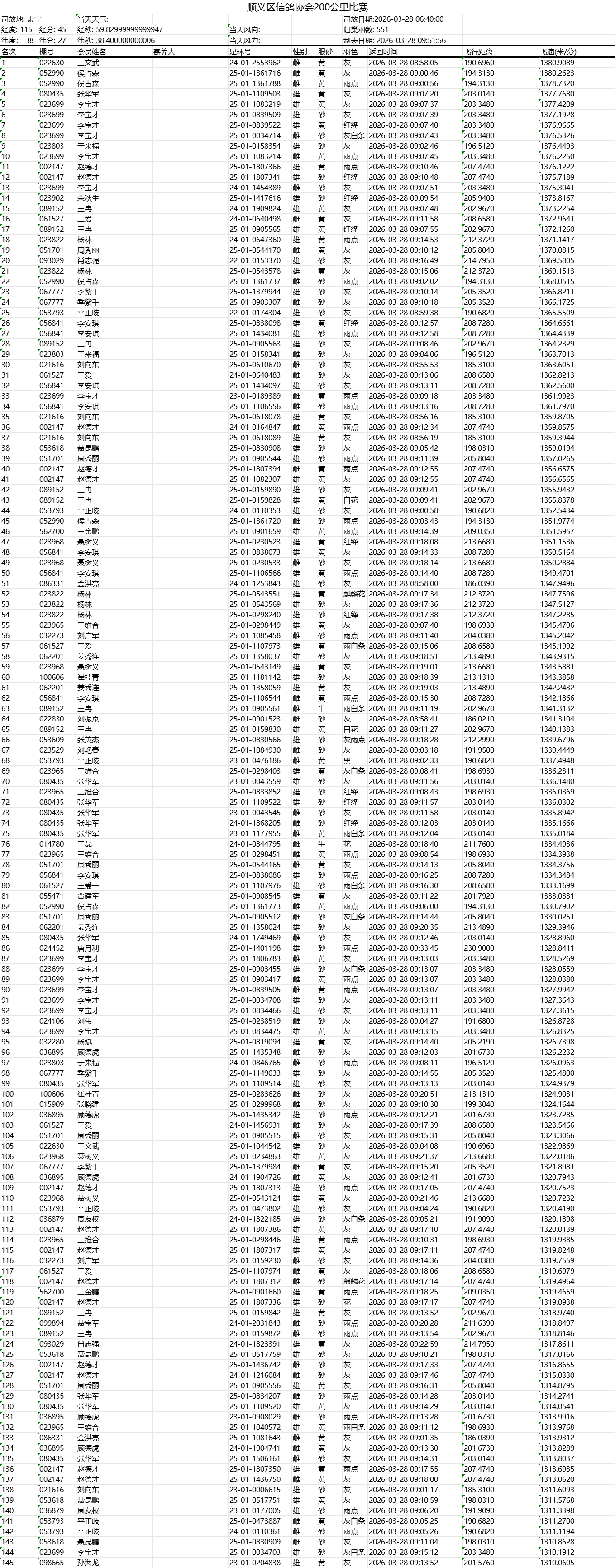 顺义区信鸽协会200公里比赛临时成绩