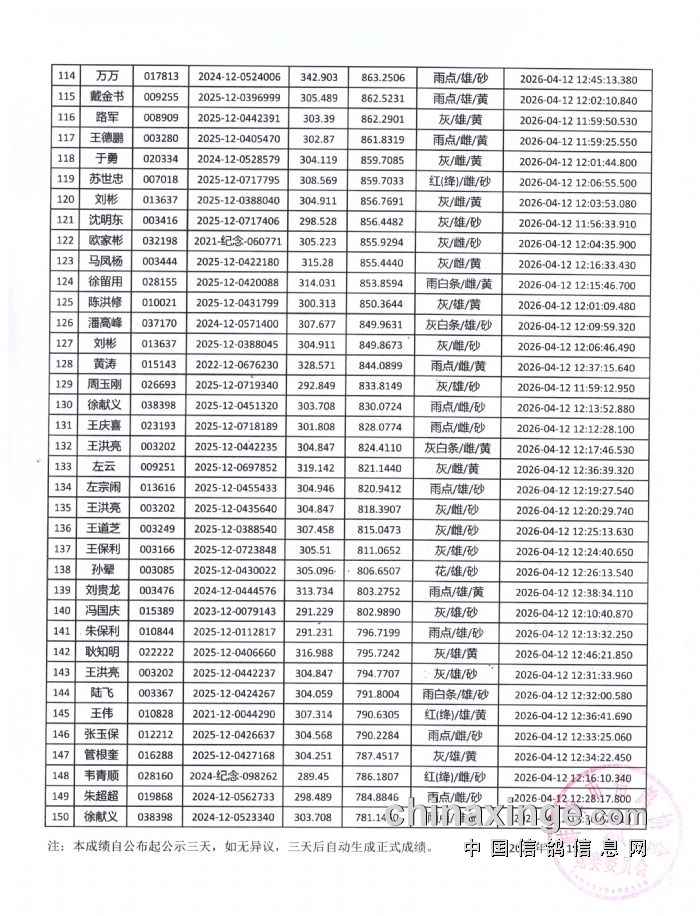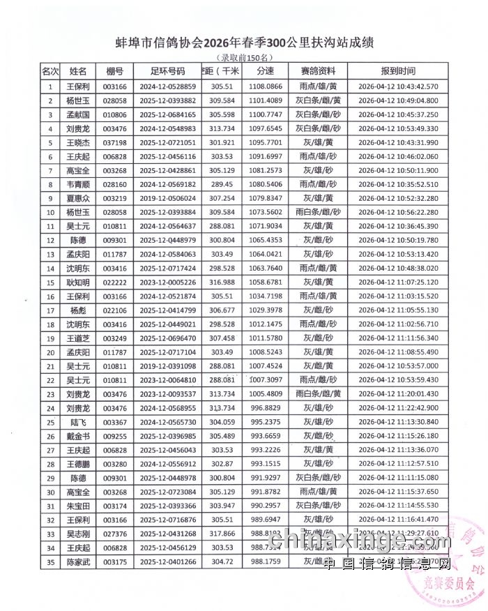 蚌埠市信鸽协会2026年春季300公里扶沟站成绩