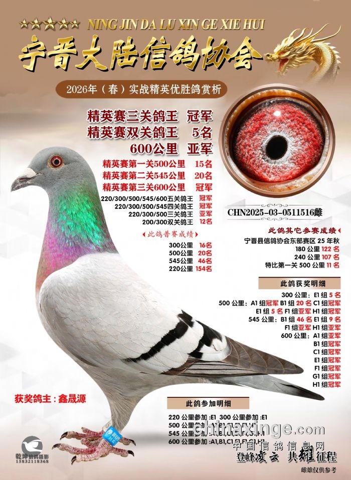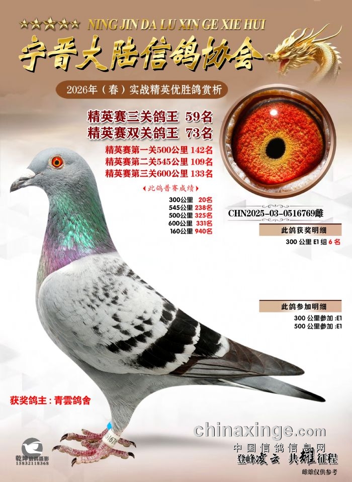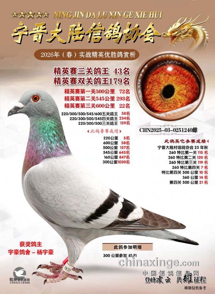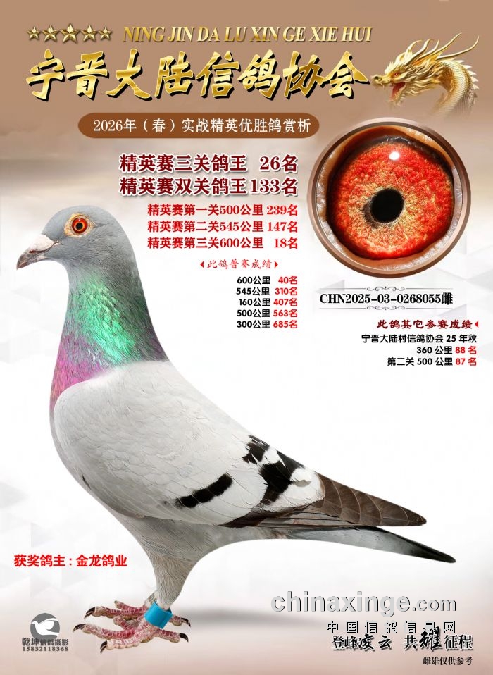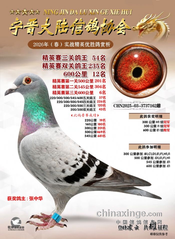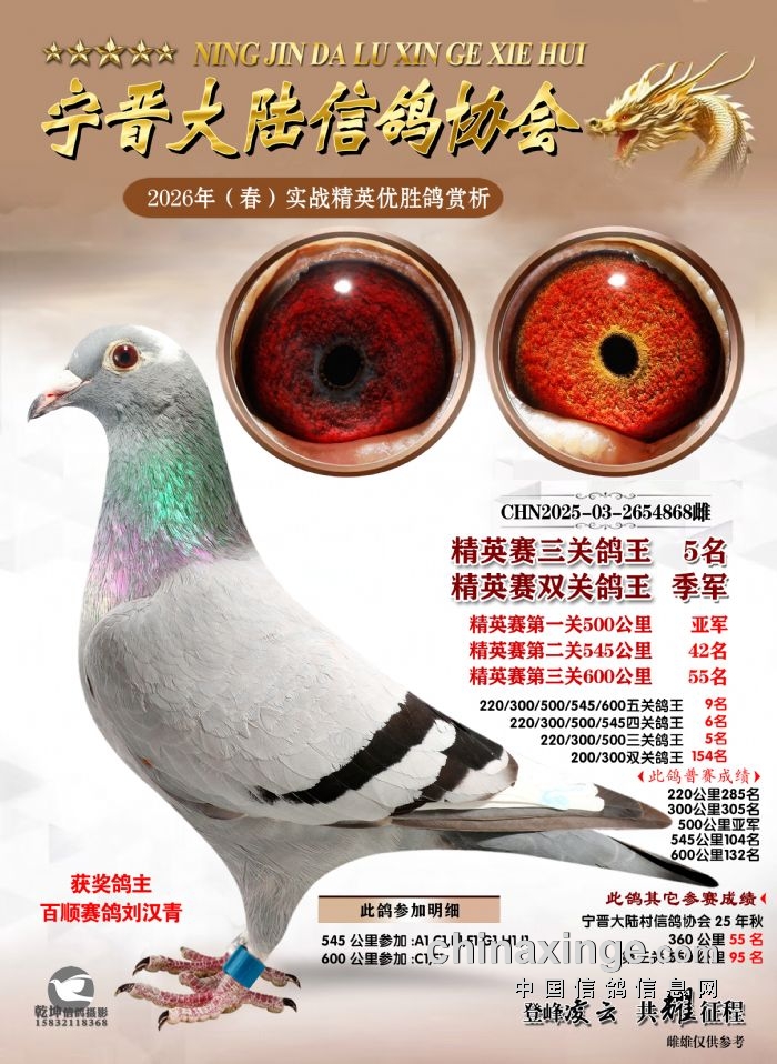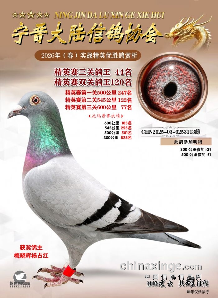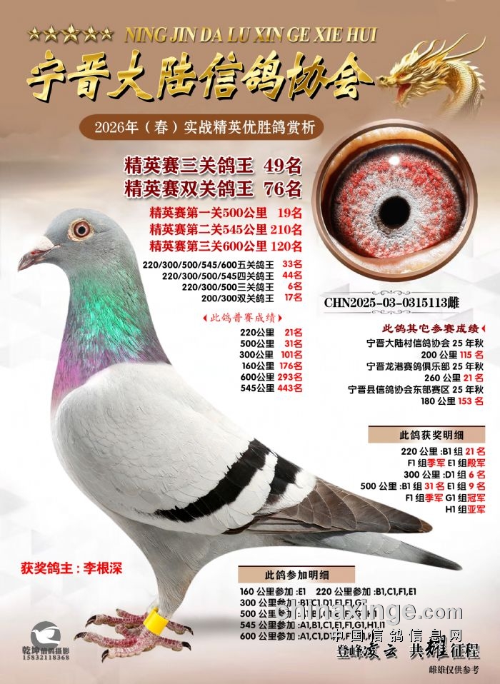 26年春精英赛五关鸽王600公里获奖鸽赏析