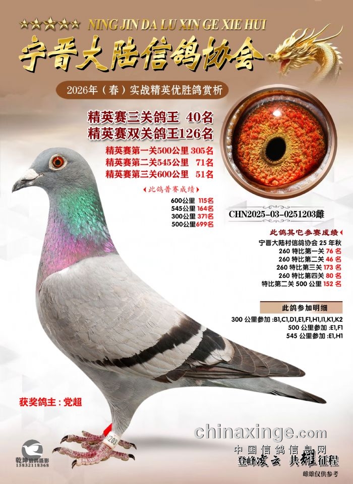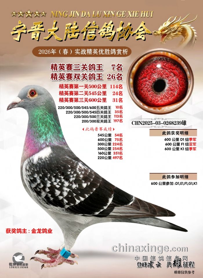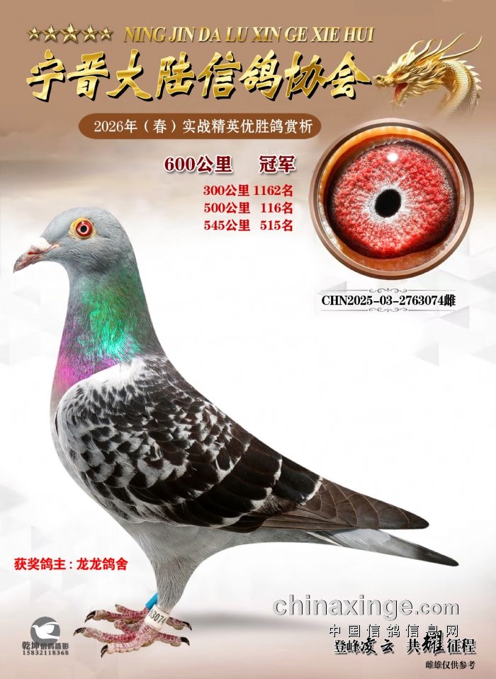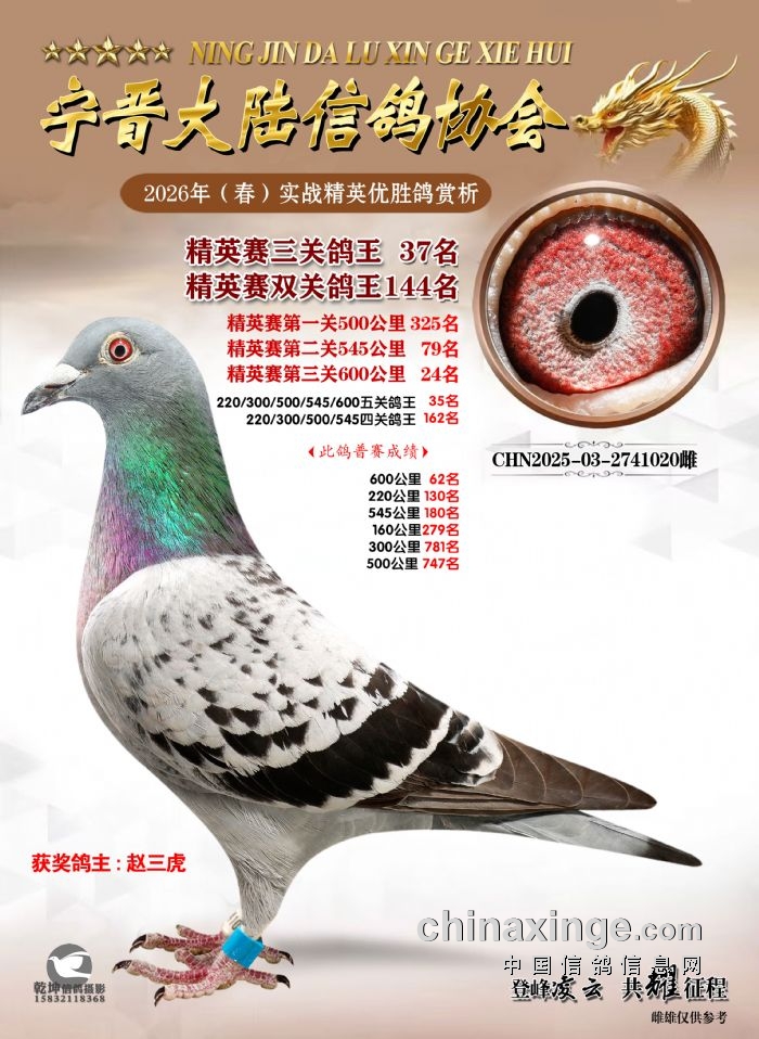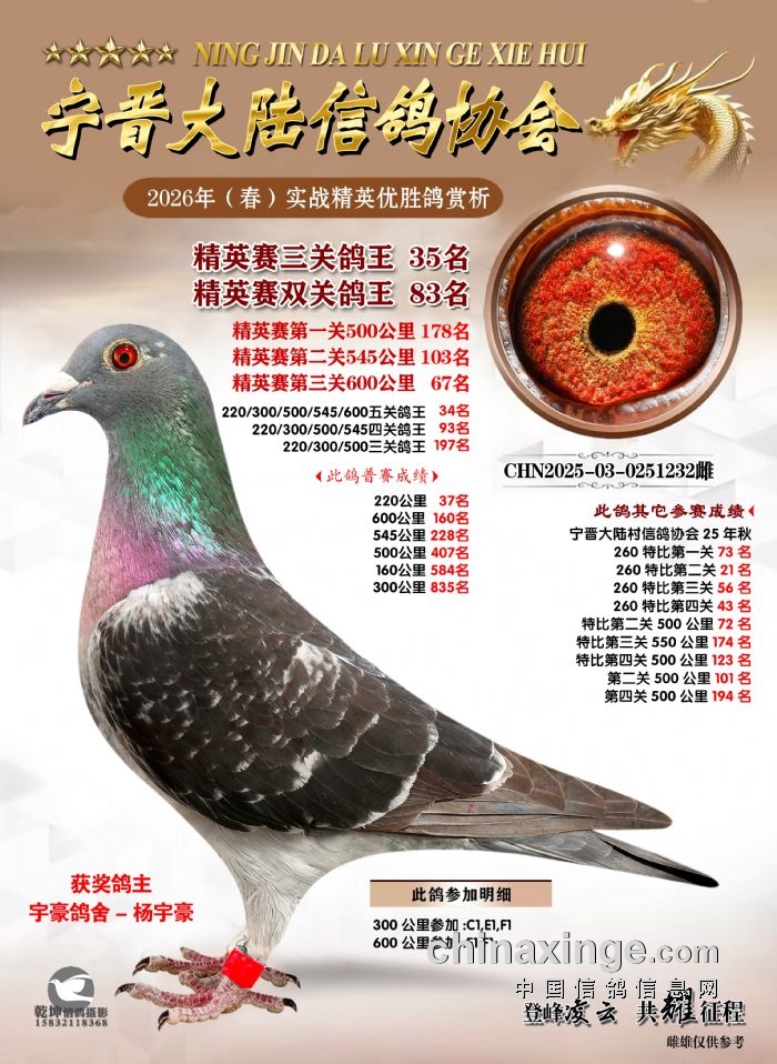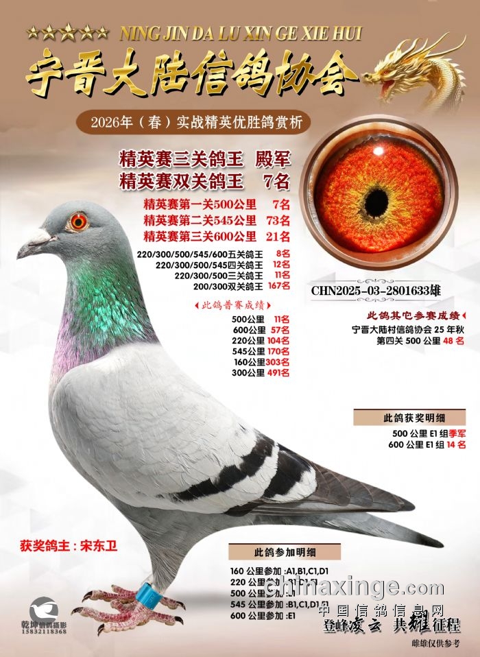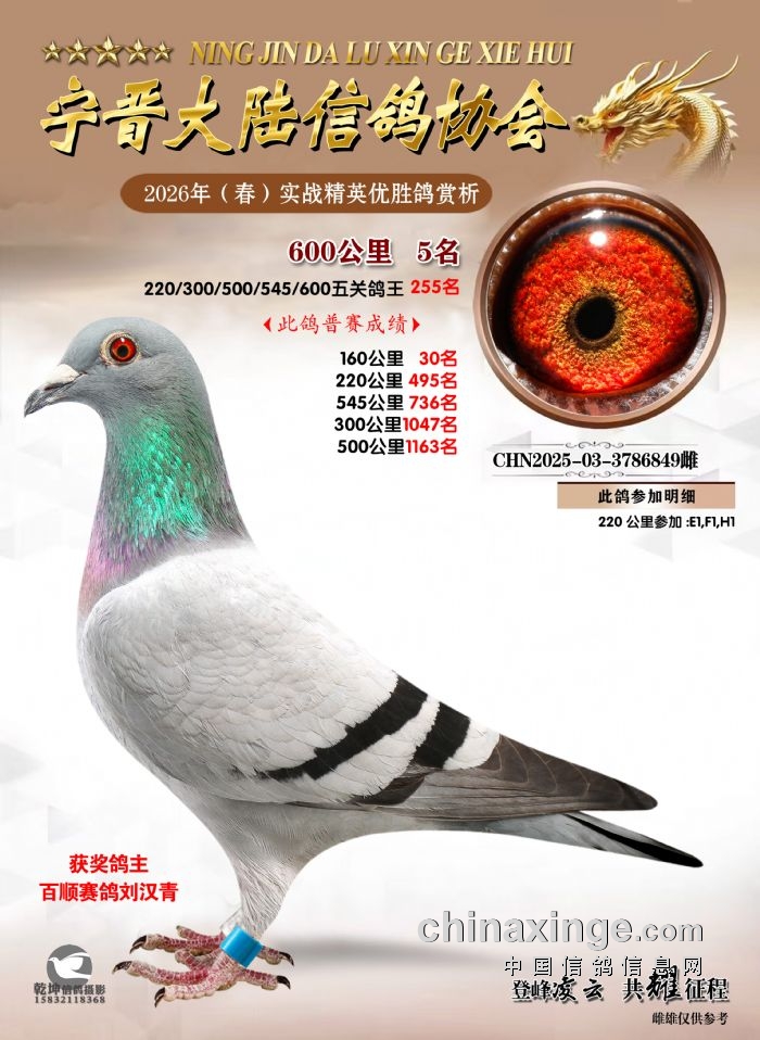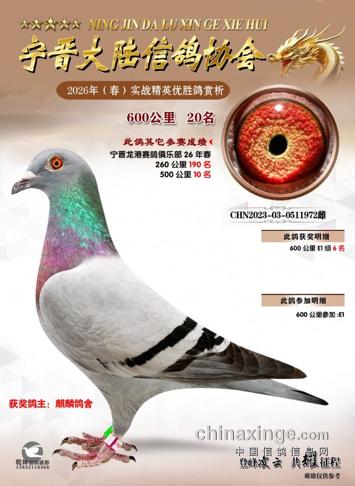 26年春精英赛五关鸽王600公里获奖鸽赏析