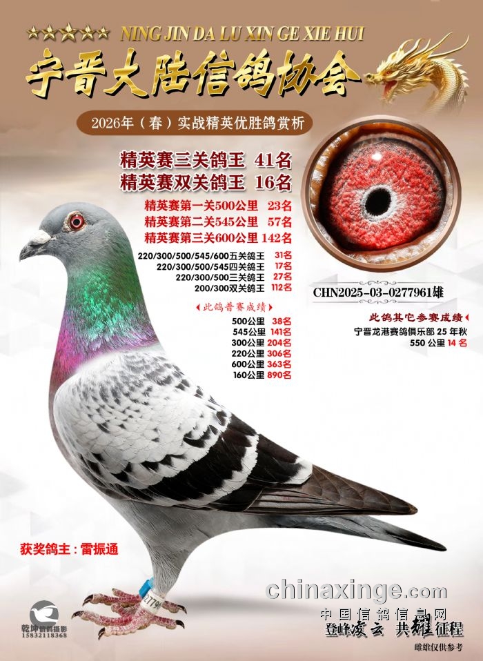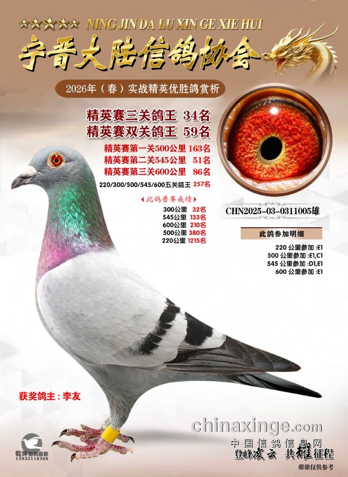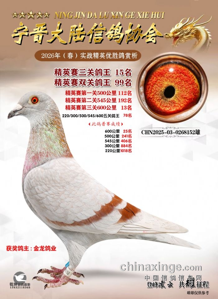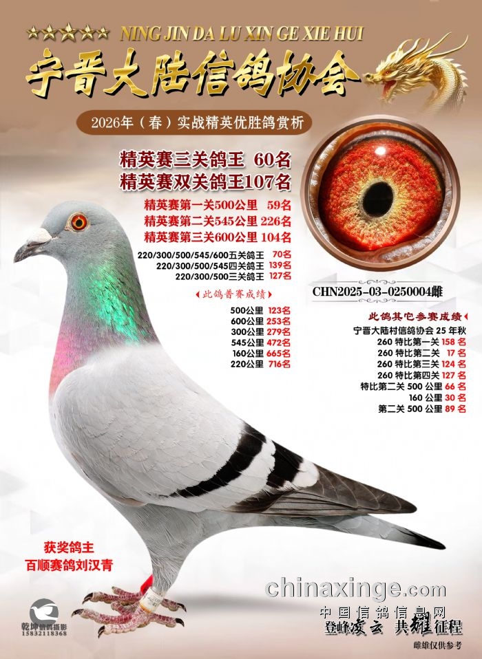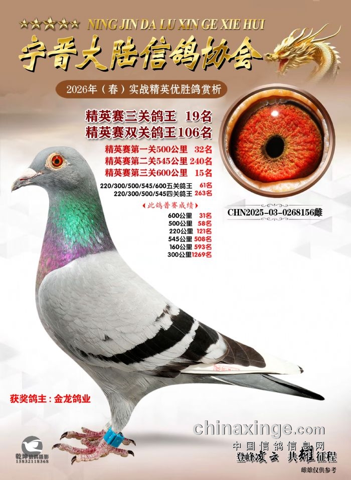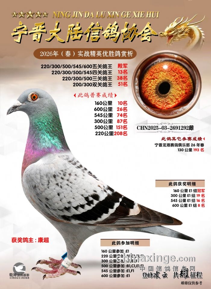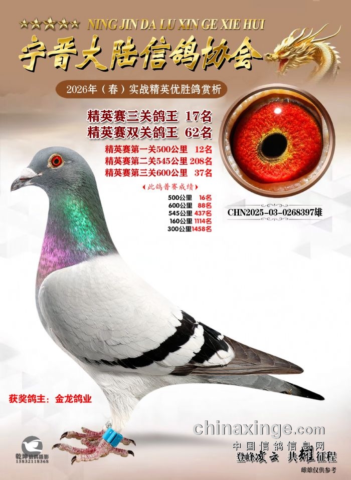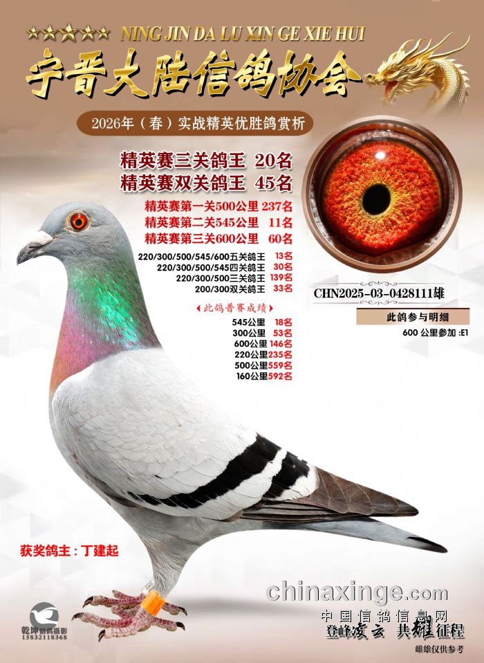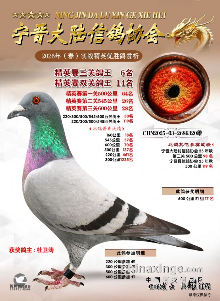 26年春精英赛五关鸽王600公里获奖鸽赏析