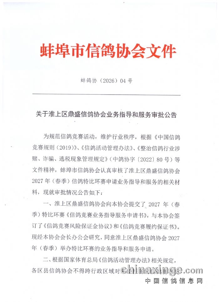 关于淮上区鼎盛信鸽协会业务指导和服务审批公告