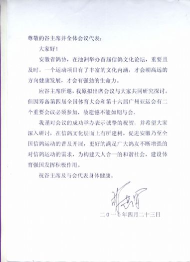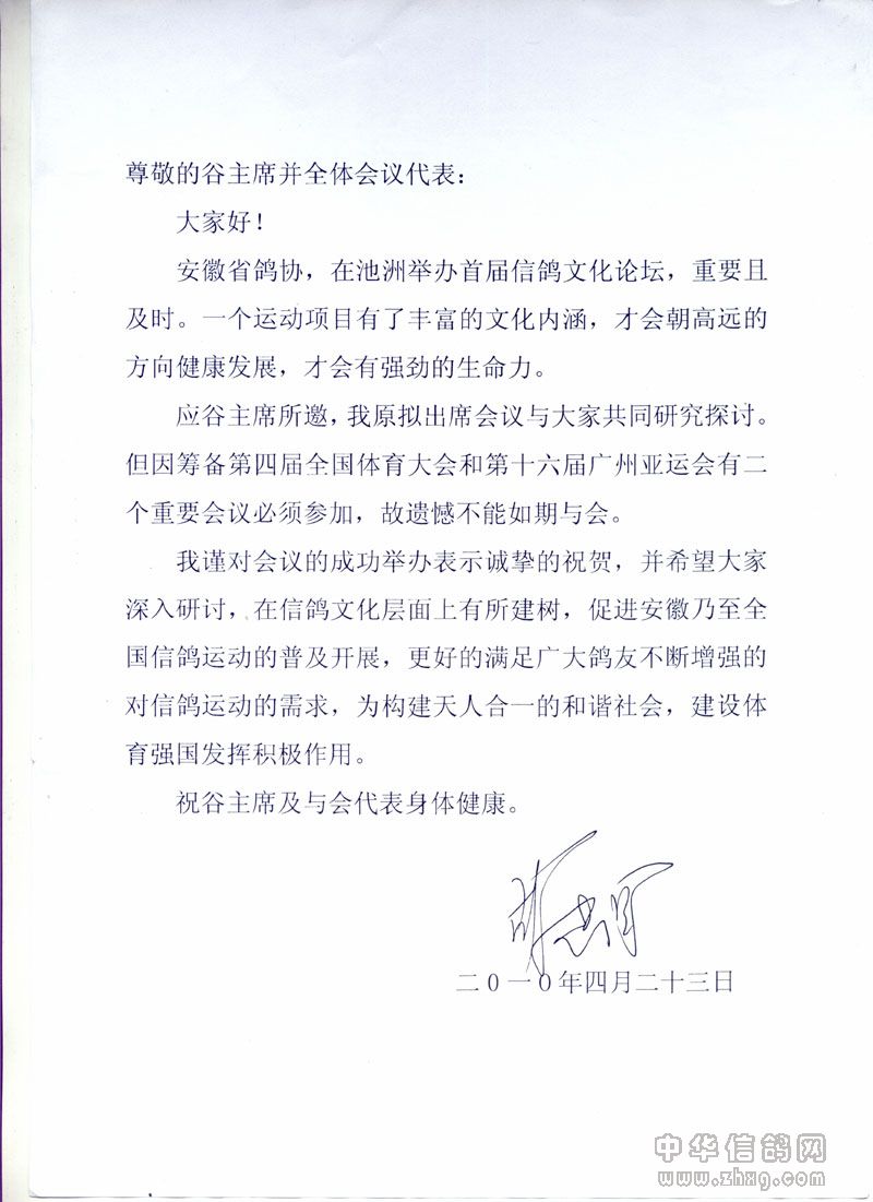 安徽省首届信鸽文化论坛会--中鸽协胡建国主席题词