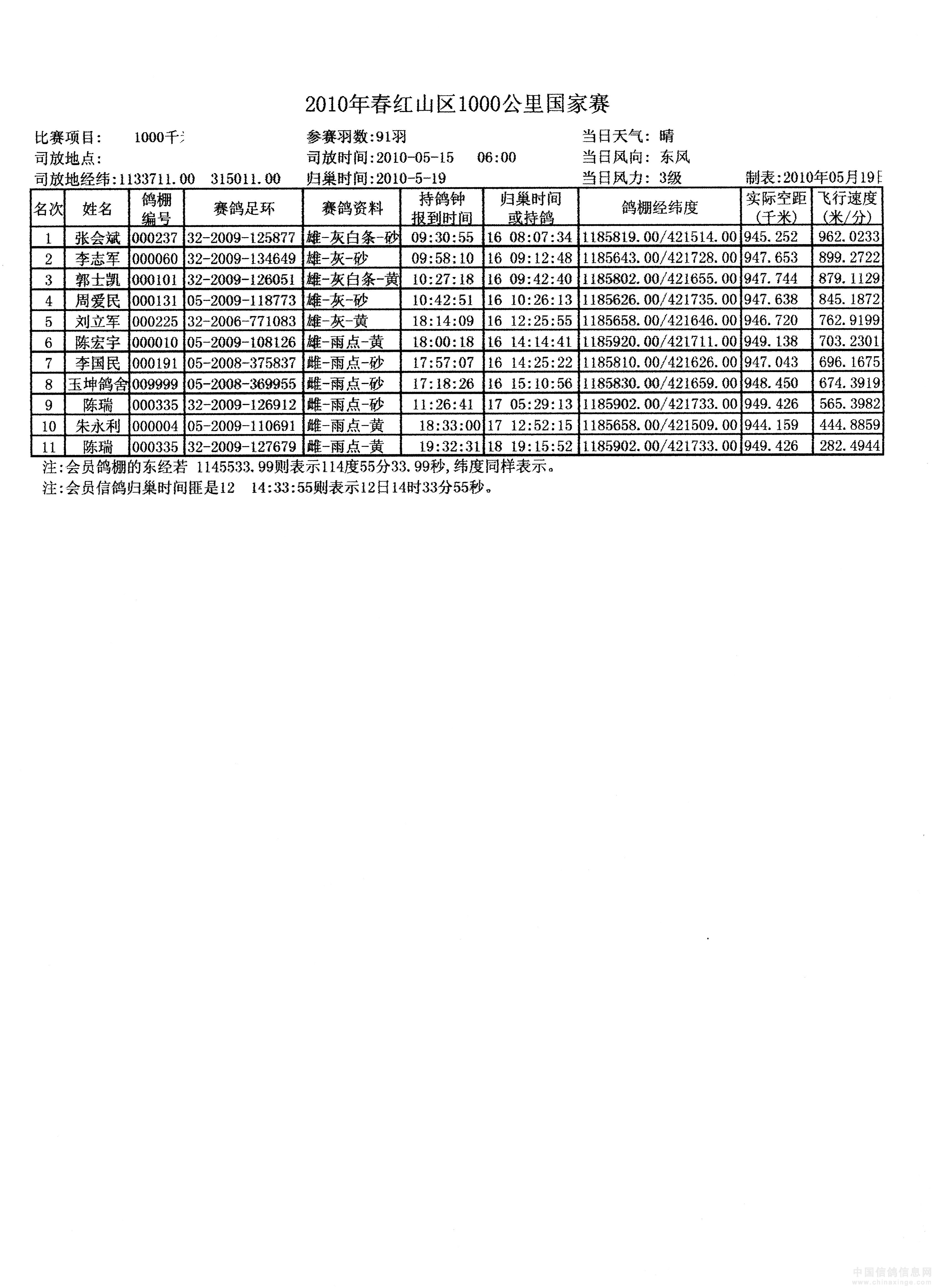 赤峰红山区鸽会2010年国家赛1000公里成绩: