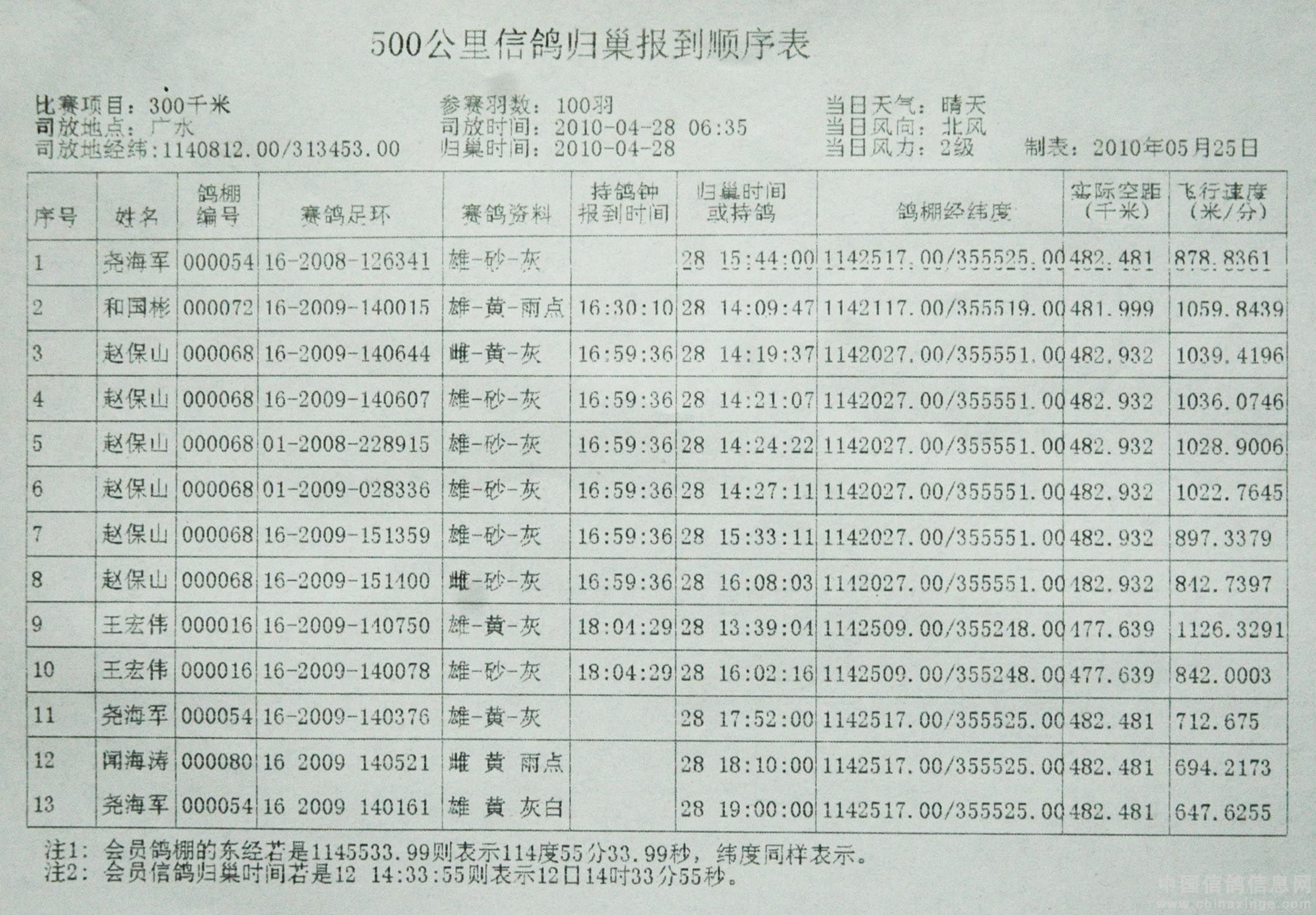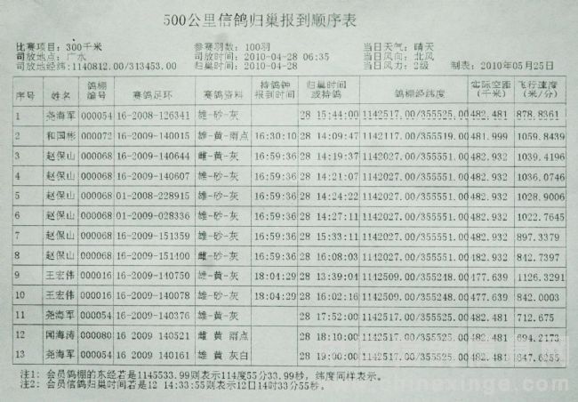 2014年秋季特比环比赛300公里指定鸽冠军、500公里46名孙福生