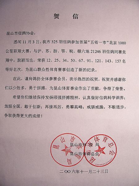 最近,昆山信鸽在“五省一市”北京1000公里联翔中取得了不俗的战绩,为此,昆山市体育局、体育总会特地发来贺信,对荣获优异成绩的全体会员表示衷心地祝贺,领导的贺信充满了上级对我们鸽协的期望!从而极大地鼓舞了广大会员的积极性,全体会员一致表示,在今后赛场上,我们将继续努力,顽强拼搏;再接再厉,勇攀高峰,争取获得更大的胜利。