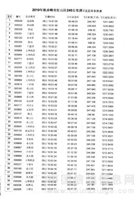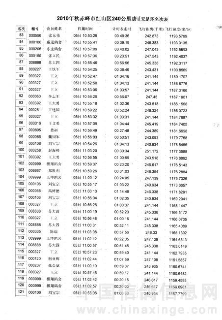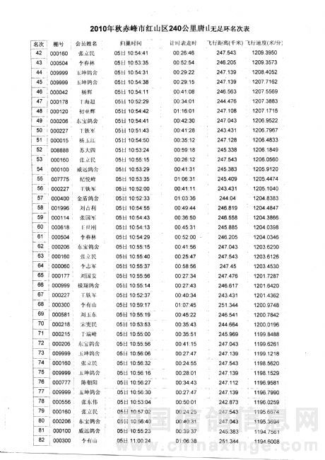 内蒙古赤峰市红山区信鸽协会2010年秋第一次240公里唐山站成绩