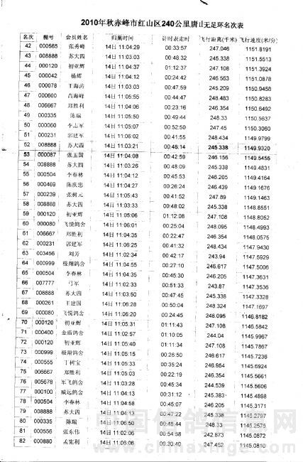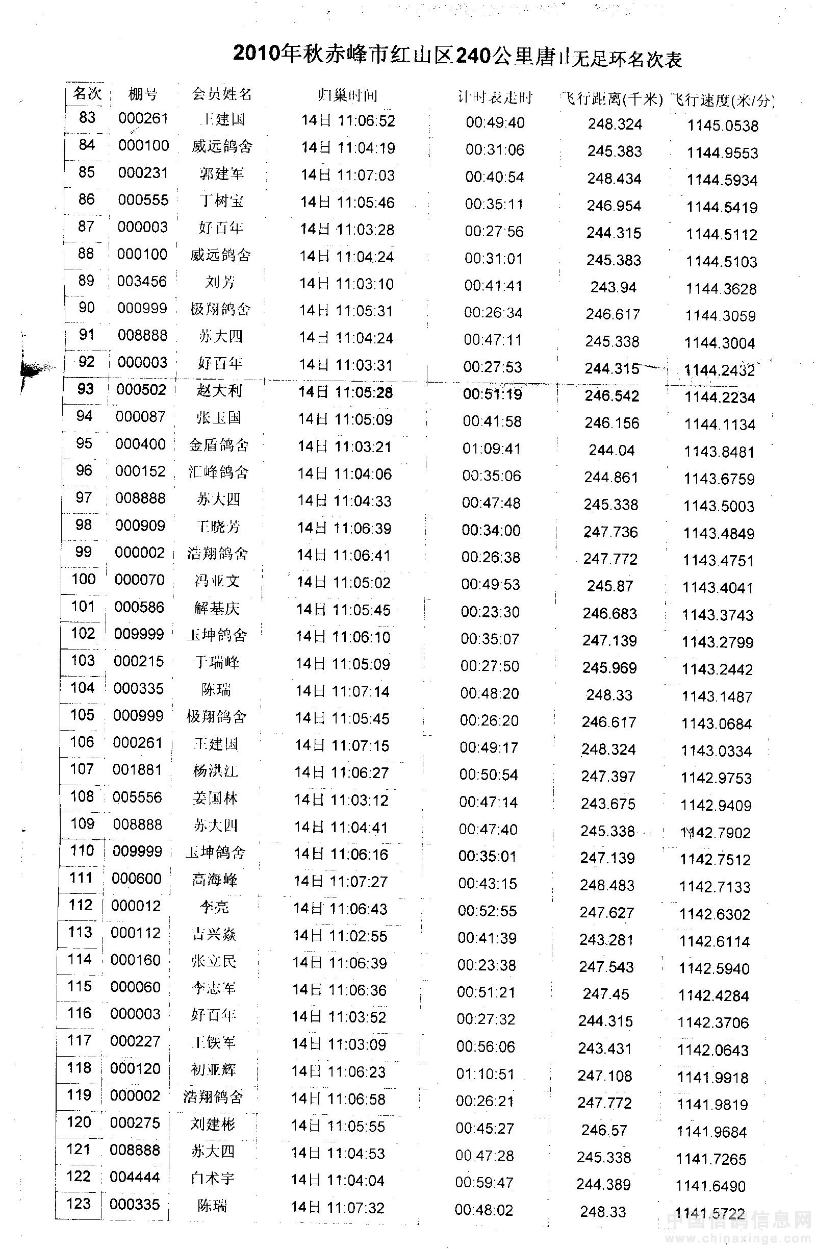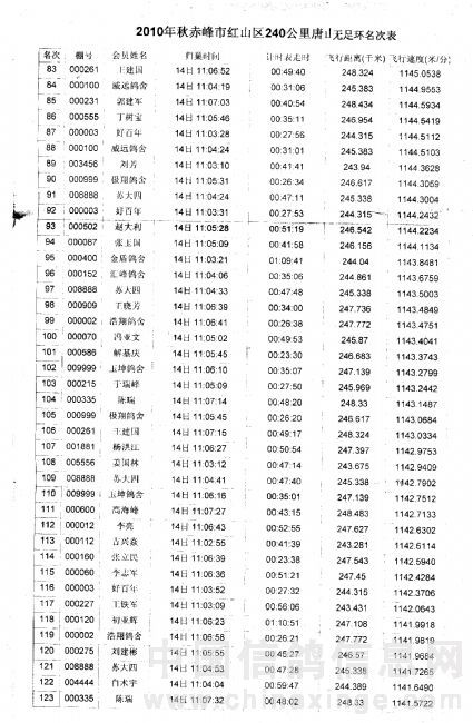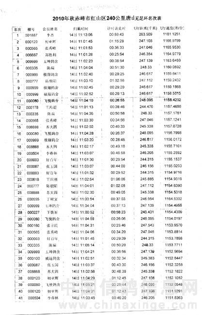 内蒙古赤峰市红山区2010年秋第二次240公里唐山单鸽成绩: