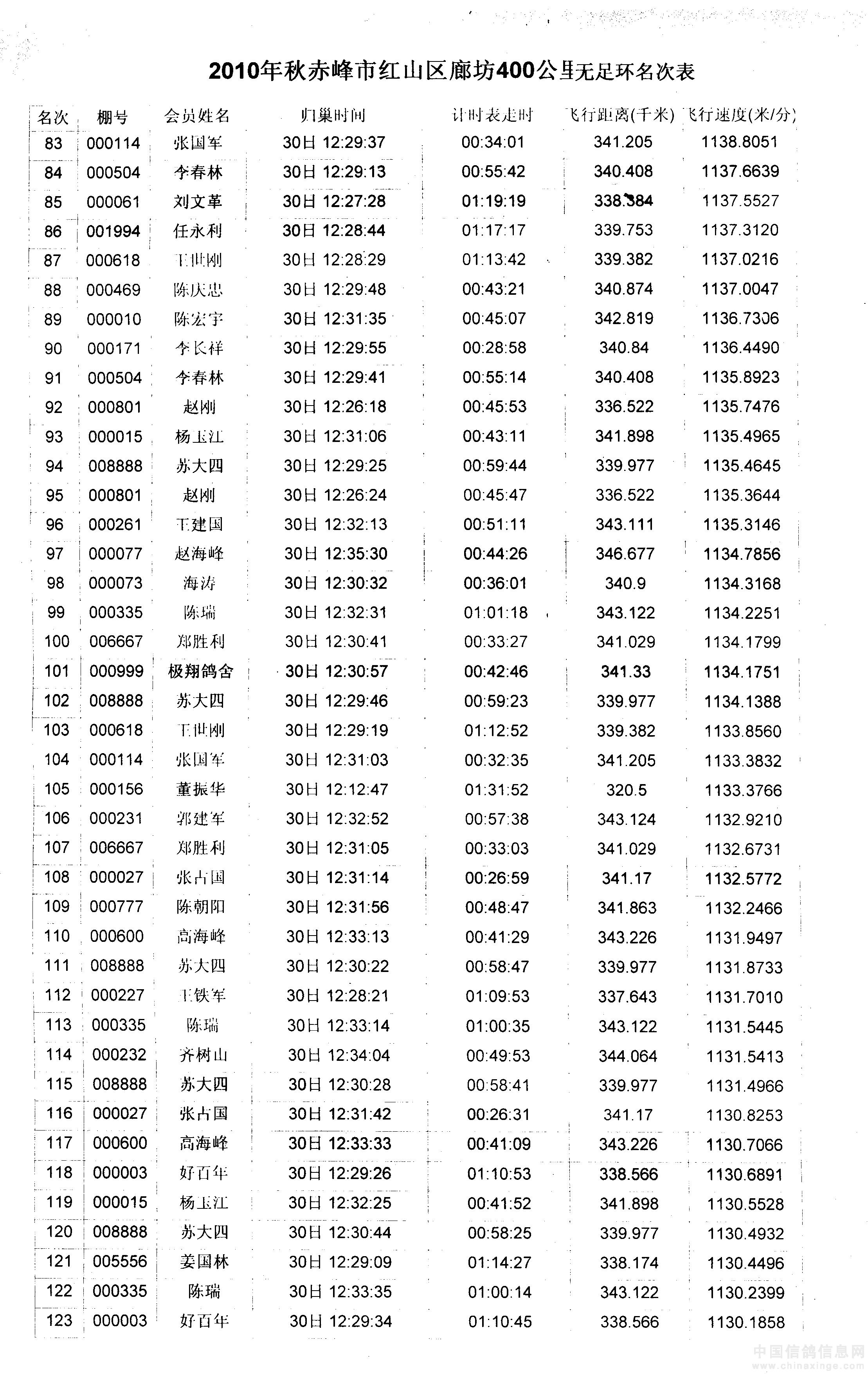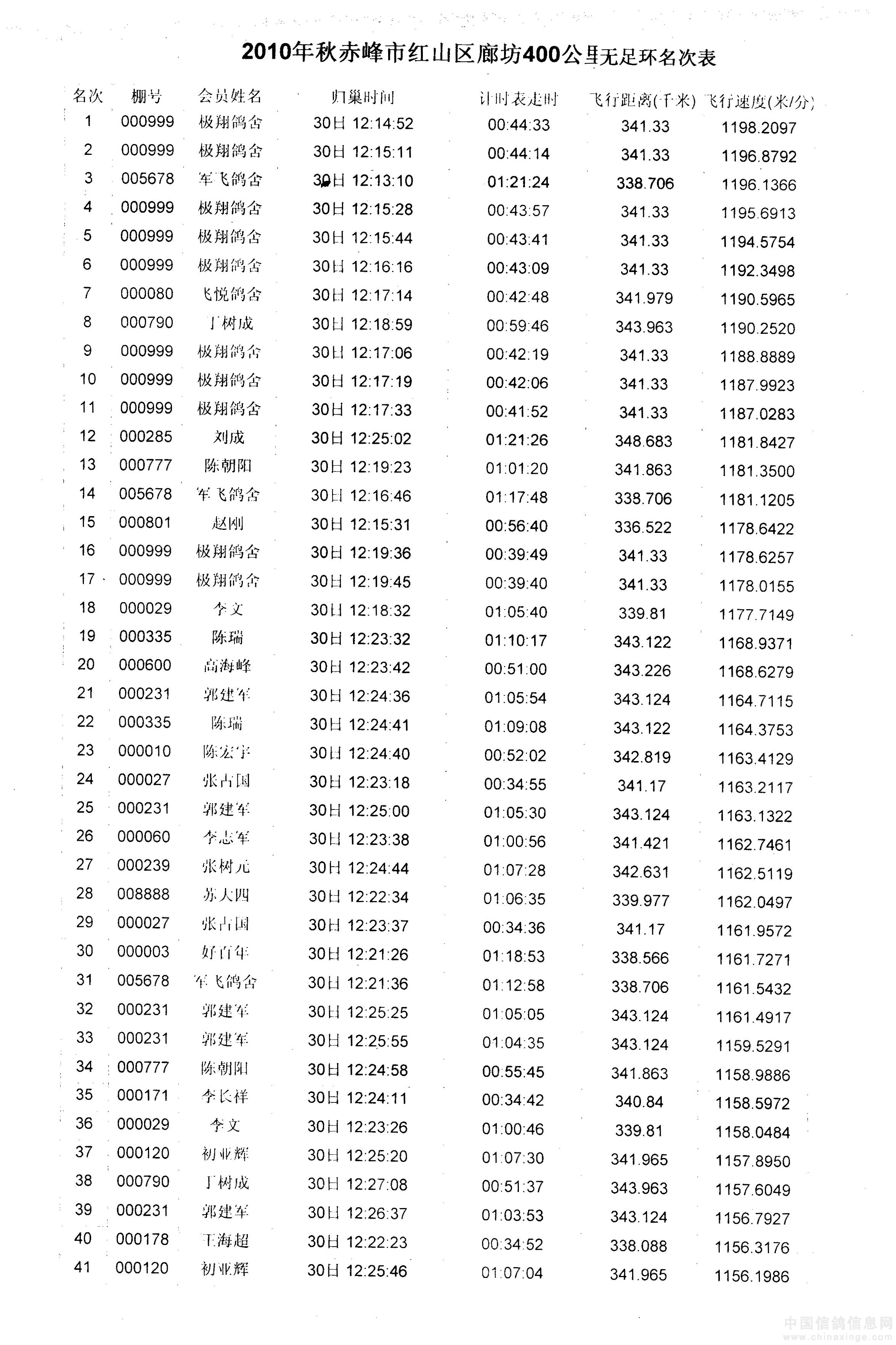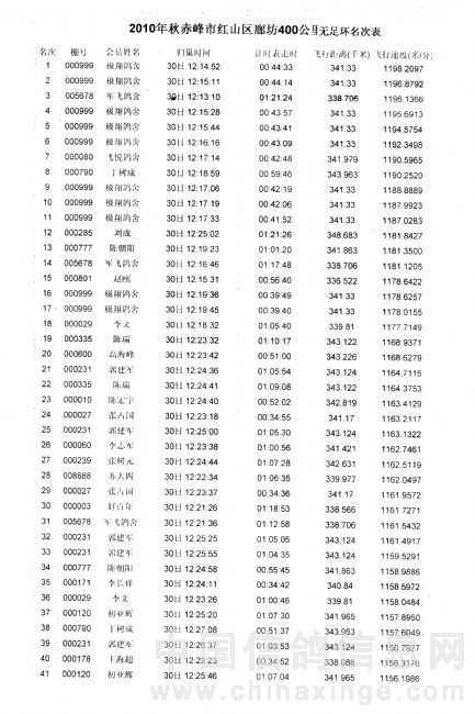 内蒙古赤峰市红山区2010年秋400公里赛单鸽成绩:(双点大图,会看清)