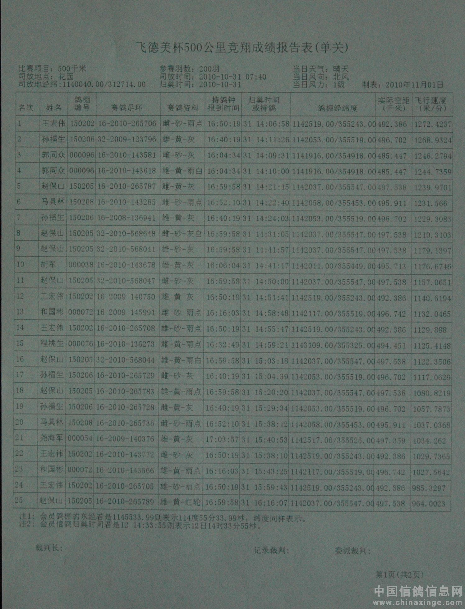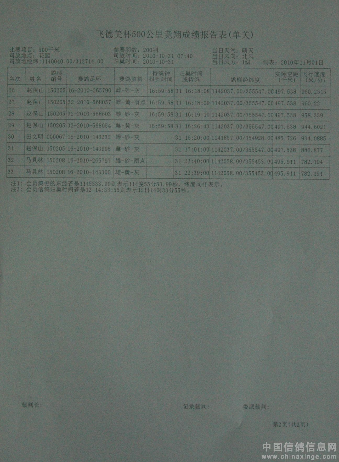 2014年秋季特比环比赛300公里指定鸽冠军、500公里46名孙福生