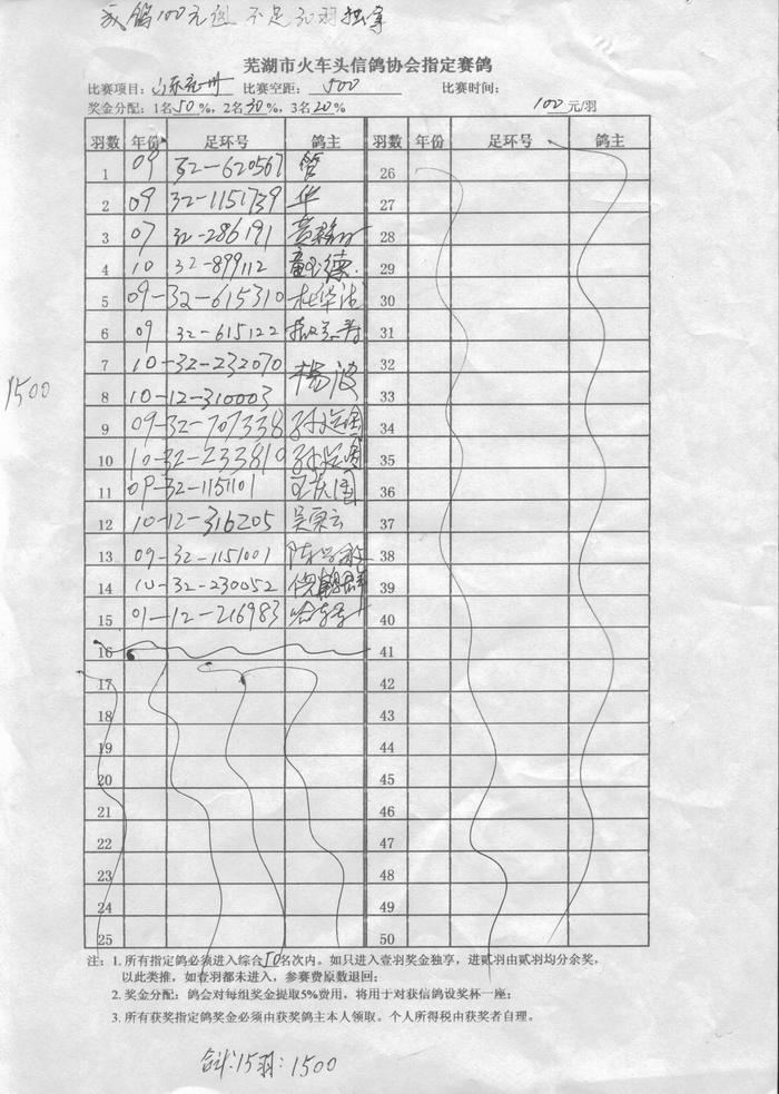 芜湖火车头信鸽协会长丰站成绩(临时)