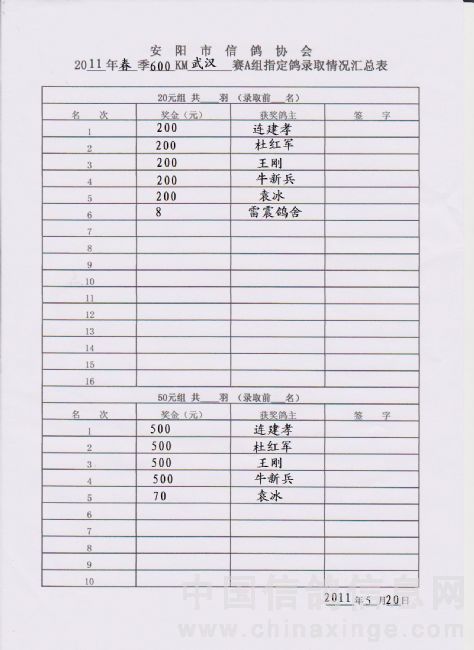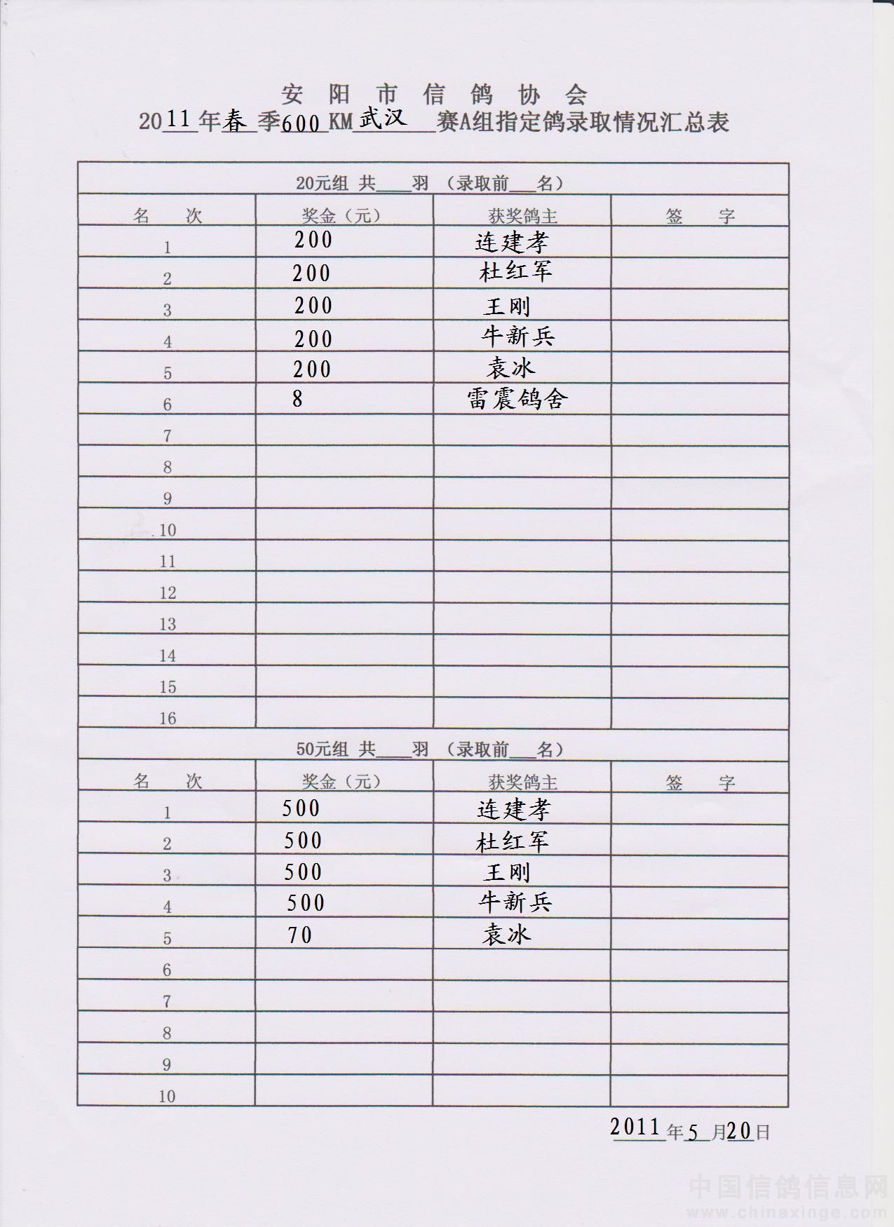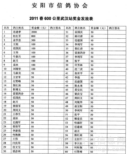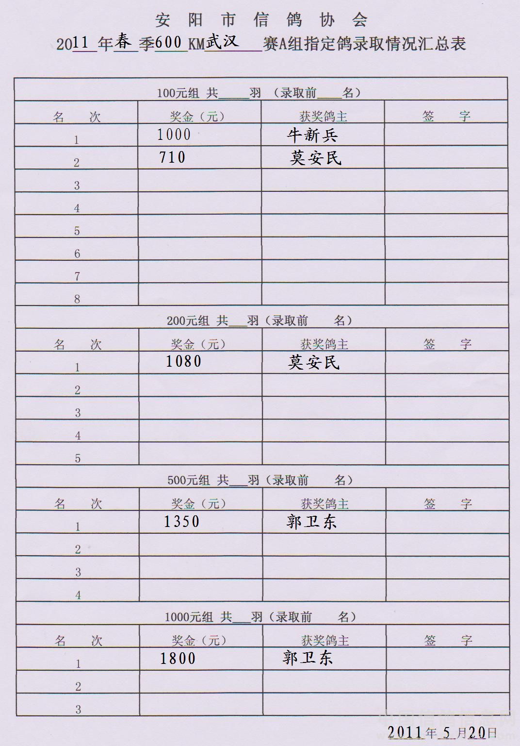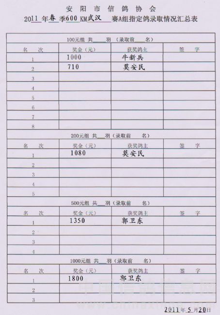 2021秋安阳市信鸽协会500公里大悟站指定获奖明细(临时)